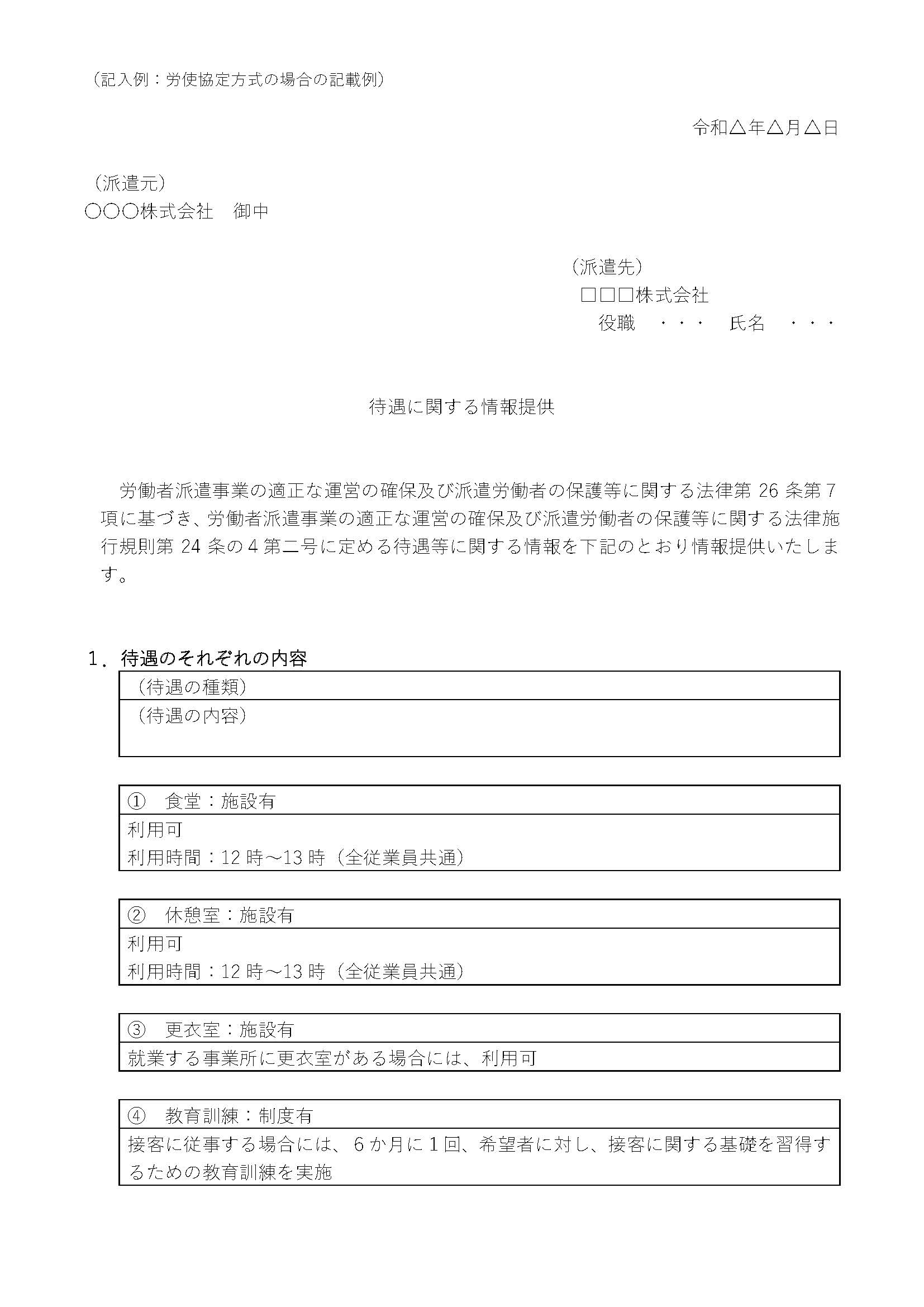 当社は労使協定方式のため、提供いただく必要がある情報は、上の表の「提供が必要な情報」の下段、① 業務に必要な能力を付与するための教育訓練、② 食堂、休憩室、更衣室の利用の2つです。